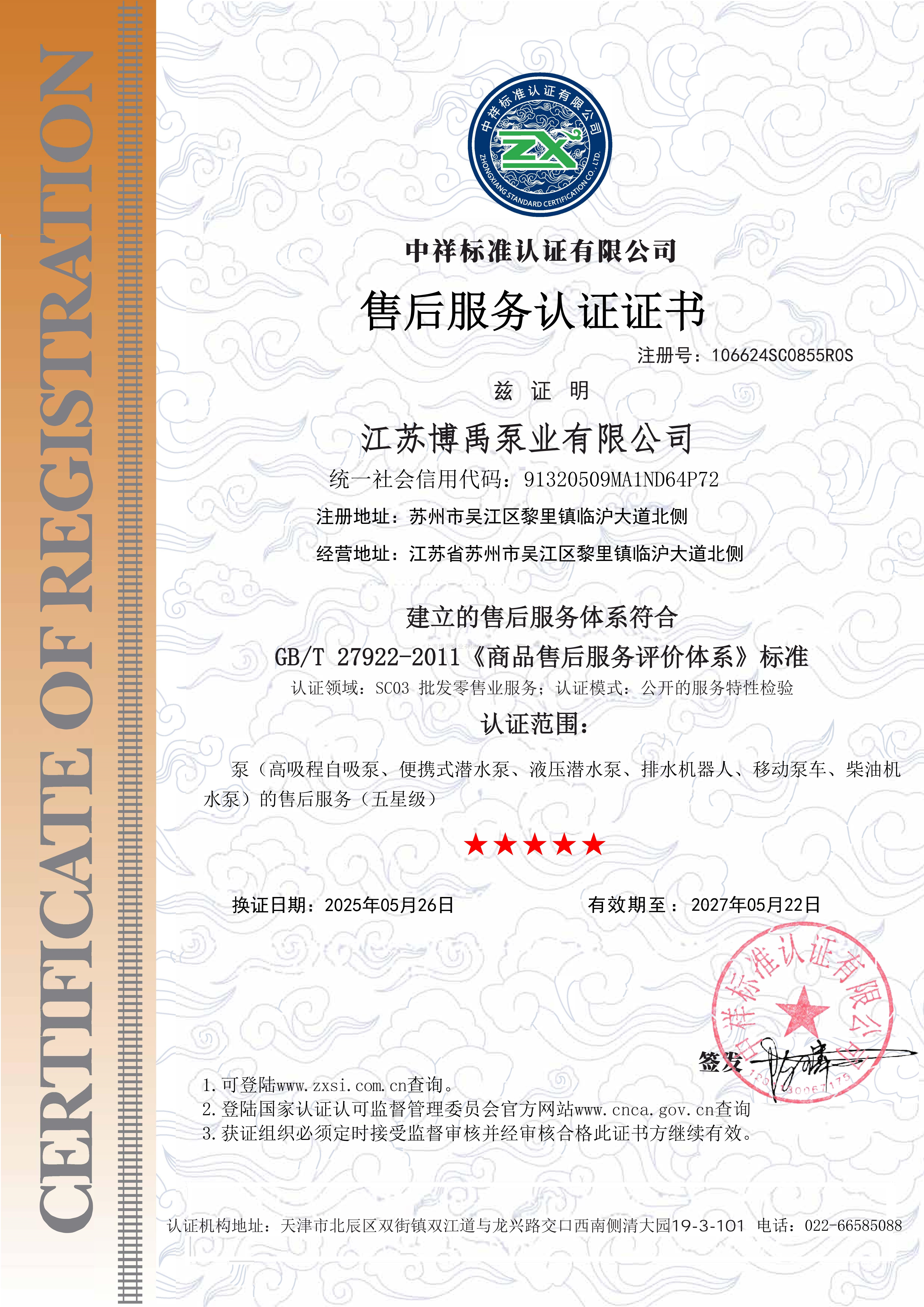 近日,上海博禹泵業(yè)有限公司旗下江蘇博禹泵業(yè)有限公司憑借完善的服務(wù)體系與客戶滿意度表現(xiàn),成功通過國家機(jī)構(gòu)認(rèn)證,榮獲"五星售后服務(wù)認(rèn)證證書"。此次認(rèn)證范圍全面覆蓋公司核心產(chǎn)品線,包括泵、高吸程自吸泵、便攜式潛水泵、液壓潛水泵、排水機(jī)器人、移動泵車及柴油機(jī)水泵等泵系列產(chǎn)品,標(biāo)志著博禹泵業(yè)在售后服務(wù)標(biāo)準(zhǔn)化、規(guī)范化建設(shè)方面達(dá)到行業(yè)一線水平。